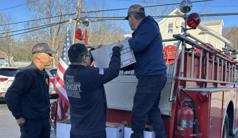 The Harmony Fire Department collaborated with The Hype Nutrition to collect food to stock the town’s food pantry this holiday season, and transported the items in their antique fire engine.