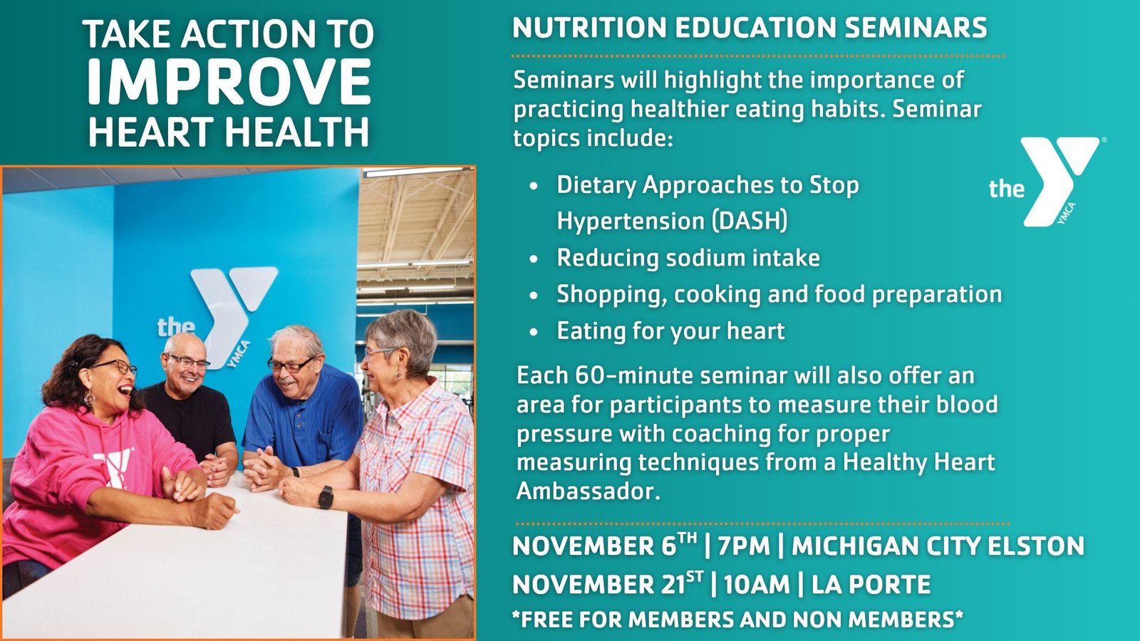 The La Porte County Family YMCA will host offer free heart-healthy nutrition education seminars for the whole community. The YMCA says those attending will learn how to make smart food choices that support your heart, manage cholesterol, and boost overall wellness. The YMCA says these seminars are perfect for anyone looking to improve heart health through nutrition, build sustainable healthy habits, and make informed choices for you and your family. The seminars will be at Michigan City Elston- Nov. 6 at 7 p.m. and at La Porte – Nov. 21- Nov. 21 at 10 a.m. The seminars are free for