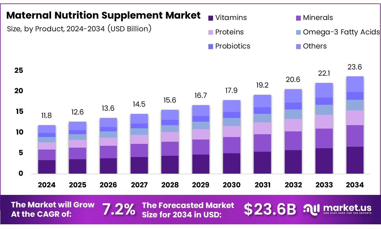 Maternal Nutrition Supplement Market size is expected to be worth around USD 23.6 Bn by 2034, from USD 11.8 Bn in 2024, at a CAGR of 7.2%